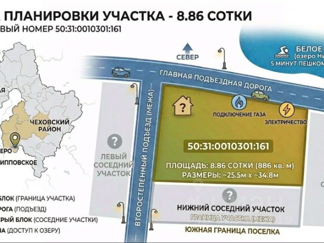 САМОЕ БОЛЬШОЕ ОЗЕРО В ЧЕХОВСКОМ РАЙОНЕ Электричество - 15 кВт. ГАЗ — проходит по границе поселка. Дороги асфальт. Прямой выход в лес. Потрясающая бесплатная рыбалка! Все виды оплат! Рассрочки! Ипотеки! Индивидуальные условия!