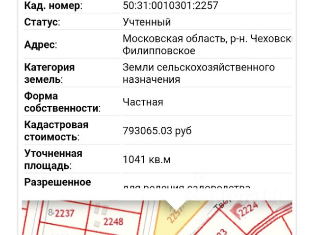 Адрес объекта отсутствует на Яндекс картах, поэтому указан ближайший. Точный адрес: ... Продам свой участок в деревне(с пропиской) рядом с озером!!! Не путайте с коттеджным посёлком и СНТ, ни каких поборов нету! Участок под строительство капитального либо дачного домика. Площадь участка 11.3 соток с возможностью расширения, в живописнейшем месте в д. Филипповское городского округа Чехов. Рядом расположены красивый залив реки Никажель, а также государственный природный заказник Широколиственный лес Булычёвского лесничества. Красивые виды и чистый воздух обеспечивают идеальные условия для жизни и отдыха! Хорошая транспортная доступность, асфальтированная дорогая до поселка. Газ по границе участка. Вся необходимая инфраструктура для комфортного, круглогодичного проживания в посёлке находится рядом: продуктовый магазин, автобусная остановка рядом с поселком, школа и детский сад расположены в с. Дубна в 10 минутах на машине. До города Чехов всего 20 минут на машине.