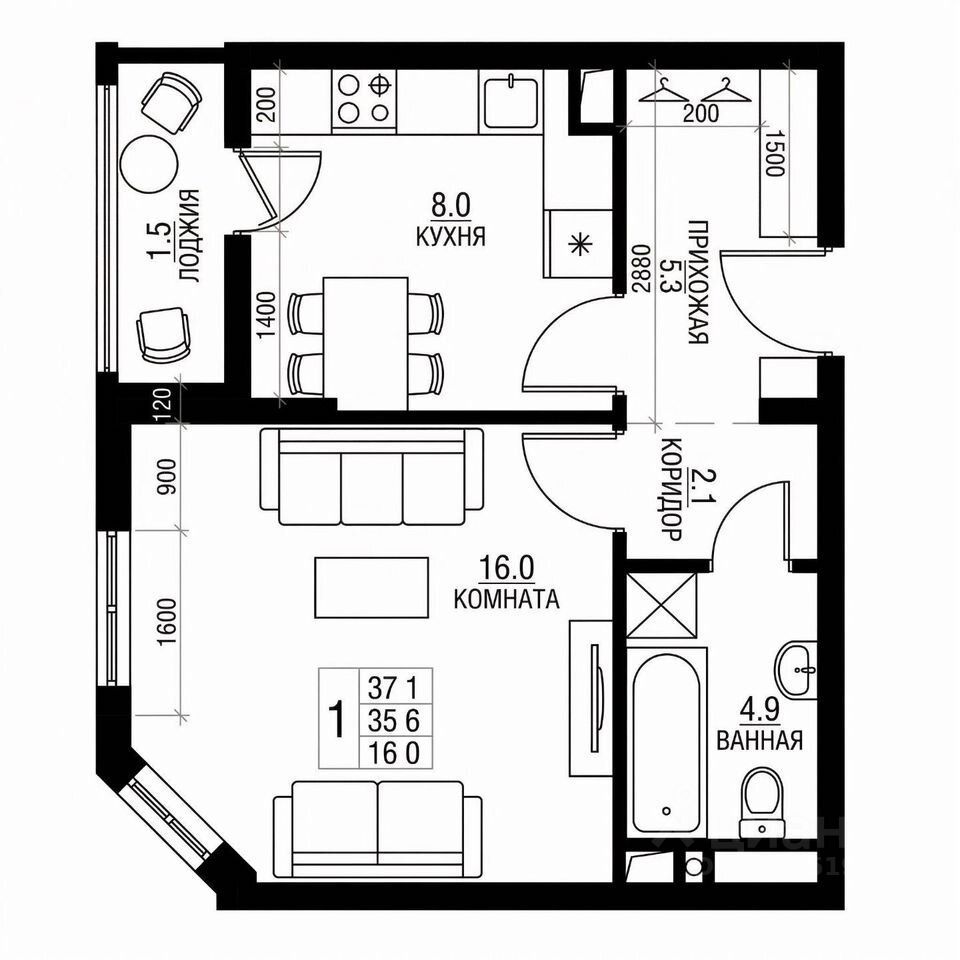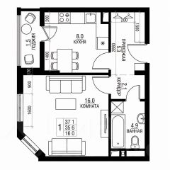 • Общая площадь: 35.3 м²